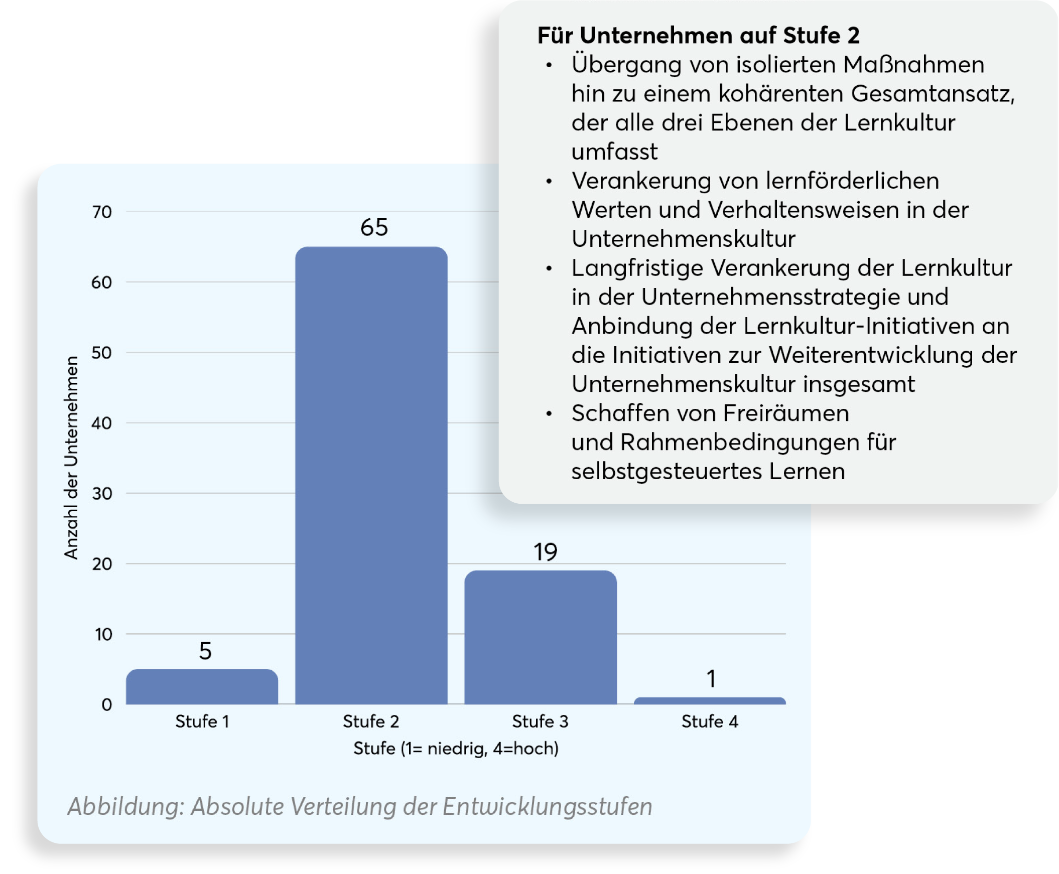 Die Metaanalyse von Lernhacks und Masterplan zeigt: Ein Großteil der Unternehmen scheint in Entwicklungsstufe 2 als Komfortzone zu stagnieren – lernförderliche Strukturen existieren überwiegend und es gibt vereinzelte Maßnahmen auf der persönlichen und kollektiven Ebene, jedoch fehlt es zumeist an der Etablierung einer tief verankerten, positiven Lernkultur.
